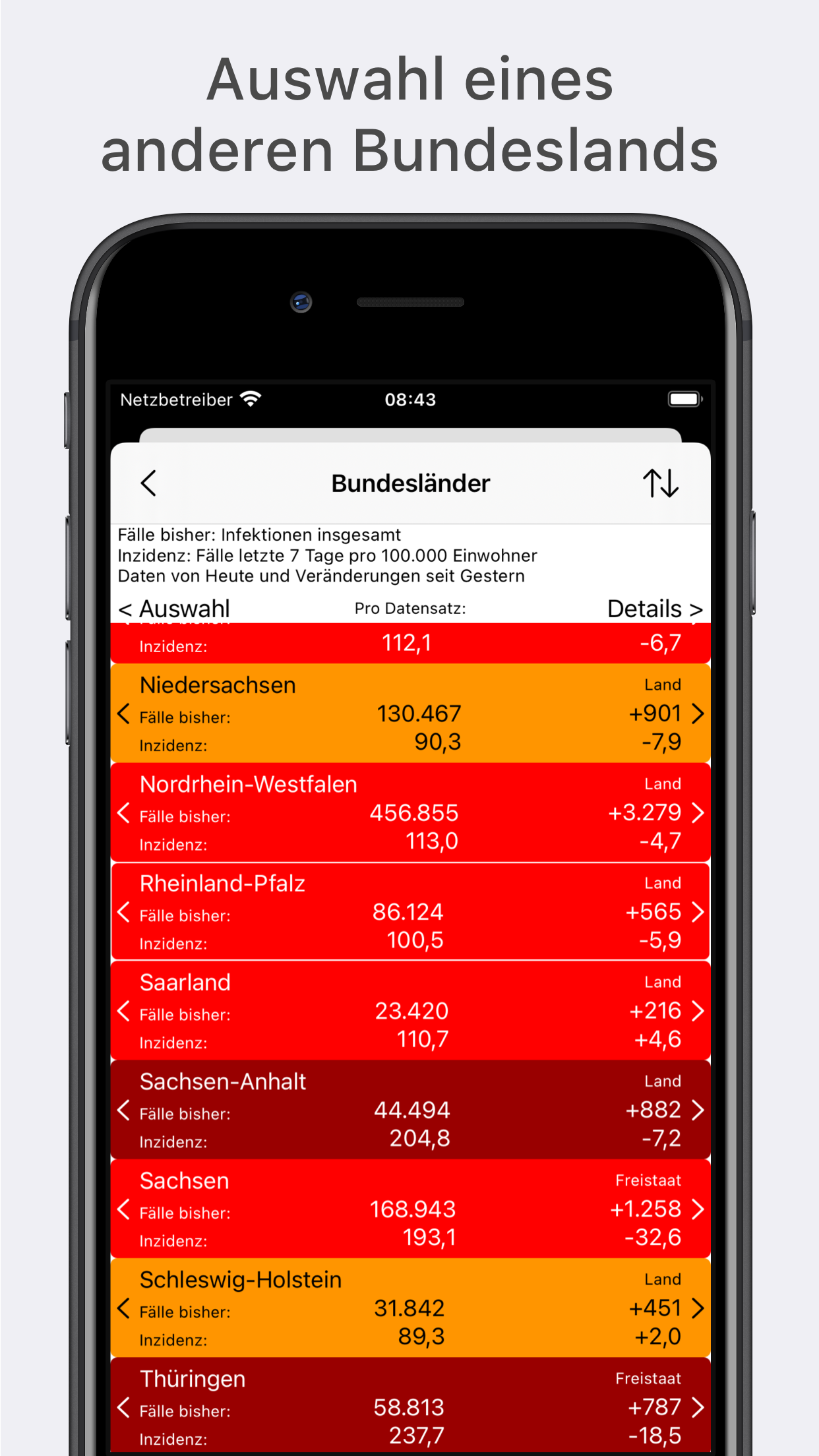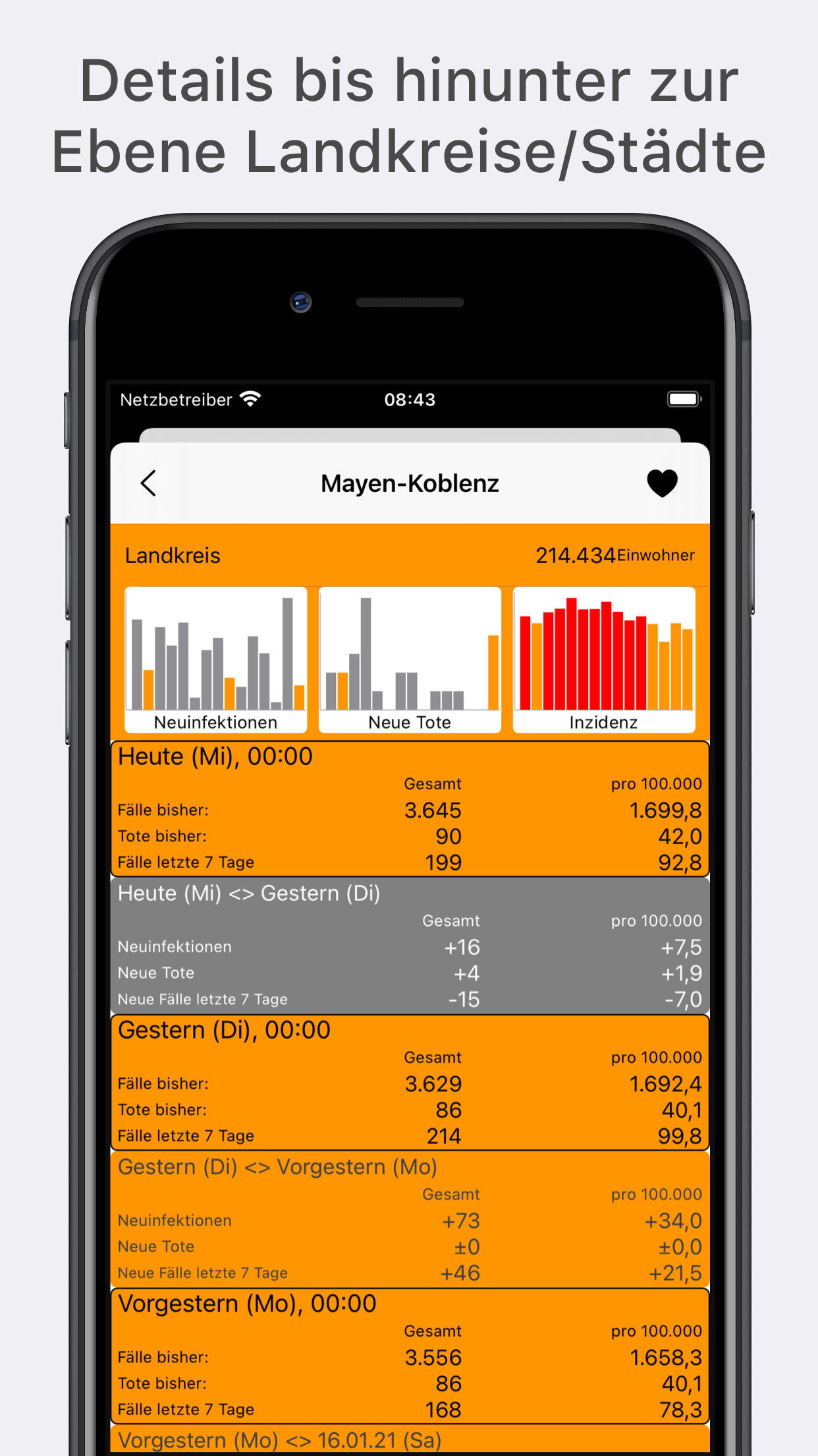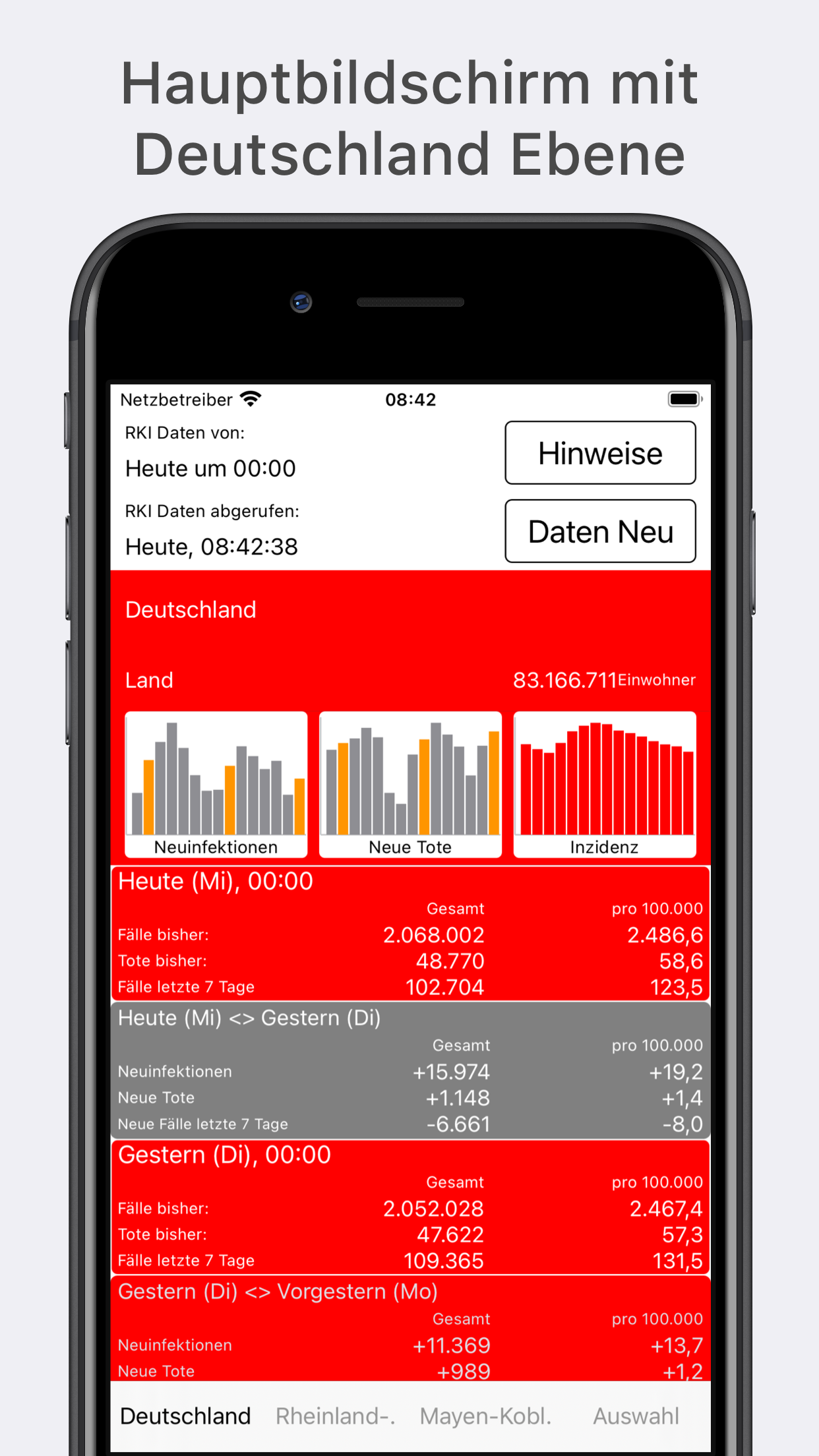 Deshalb habe ich eine kleine App entwickelt, die die Daten der RKI-Webschnittstelle auf mobilen Geräten tabellarisch und grafisch darstellt. Dabei kann man sich auch persönliche Favoriten zusammenstellen.