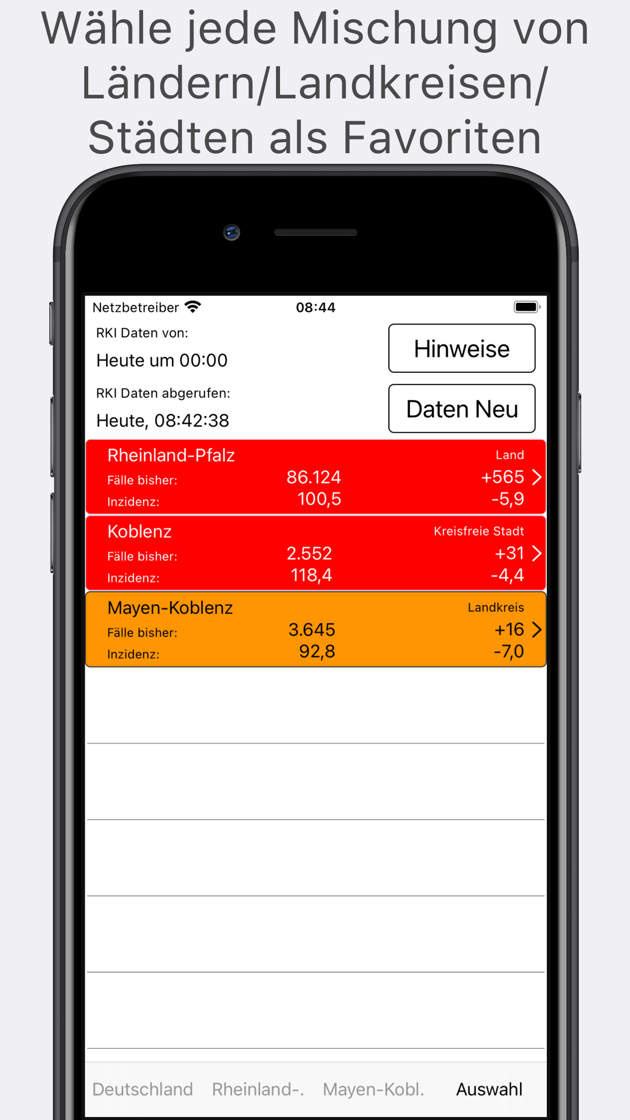 Deshalb habe ich eine kleine App entwickelt, die die Daten der RKI-Webschnittstelle auf mobilen Geräten tabellarisch und grafisch darstellt. Dabei kann man sich auch persönliche Favoriten zusammenstellen.